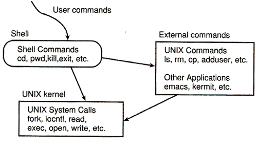 附图展示了 shell 是如何执行命令解释的,shell 首先检查命令是否是内部命令,不是的话再检查是否是一个应用程序,这里的应用程序可以是Linux本身的实用程序,比如ls 和 rm,也可以是购买的商业程序,比如 xv,或者是公用软件(public domain software),就象 ghostview。然后shell试着在搜索路径里寻找这些应用程序。搜索路径是一个能找到可执行程序的目录列表。如果你键入的命令不是一个内部命令并且在路径里没有找到这个可执行文件,将会显示一条错误信息。而如果命令被成功的找到的话,shell的内部命令或应用程序将被分解为系统调用并传给Linux内核。